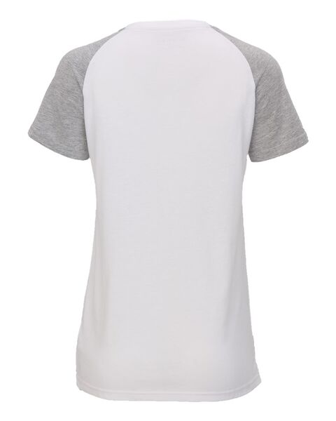 6 oz./yd_, 50/50 cotton/ polyester brushed jersey Regular, relaxed fit Contrasting rib V-neck trim Self-fabric back neck tape Oxford Heather raglan...