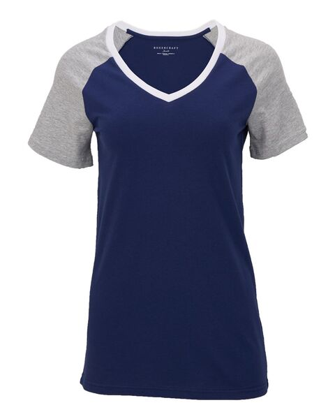 6 oz./yd_, 50/50 cotton/ polyester brushed jersey Regular, relaxed fit Contrasting rib V-neck trim Self-fabric back neck tape Oxford Heather raglan...