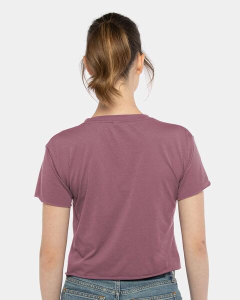 3.5 oz./yd_, 65/35 polyester/combed ring-spun cotton, 40 singles Relaxed, modest fit 1x1 baby rib, relaxed crew neckline Raw edge sleeves and hem...