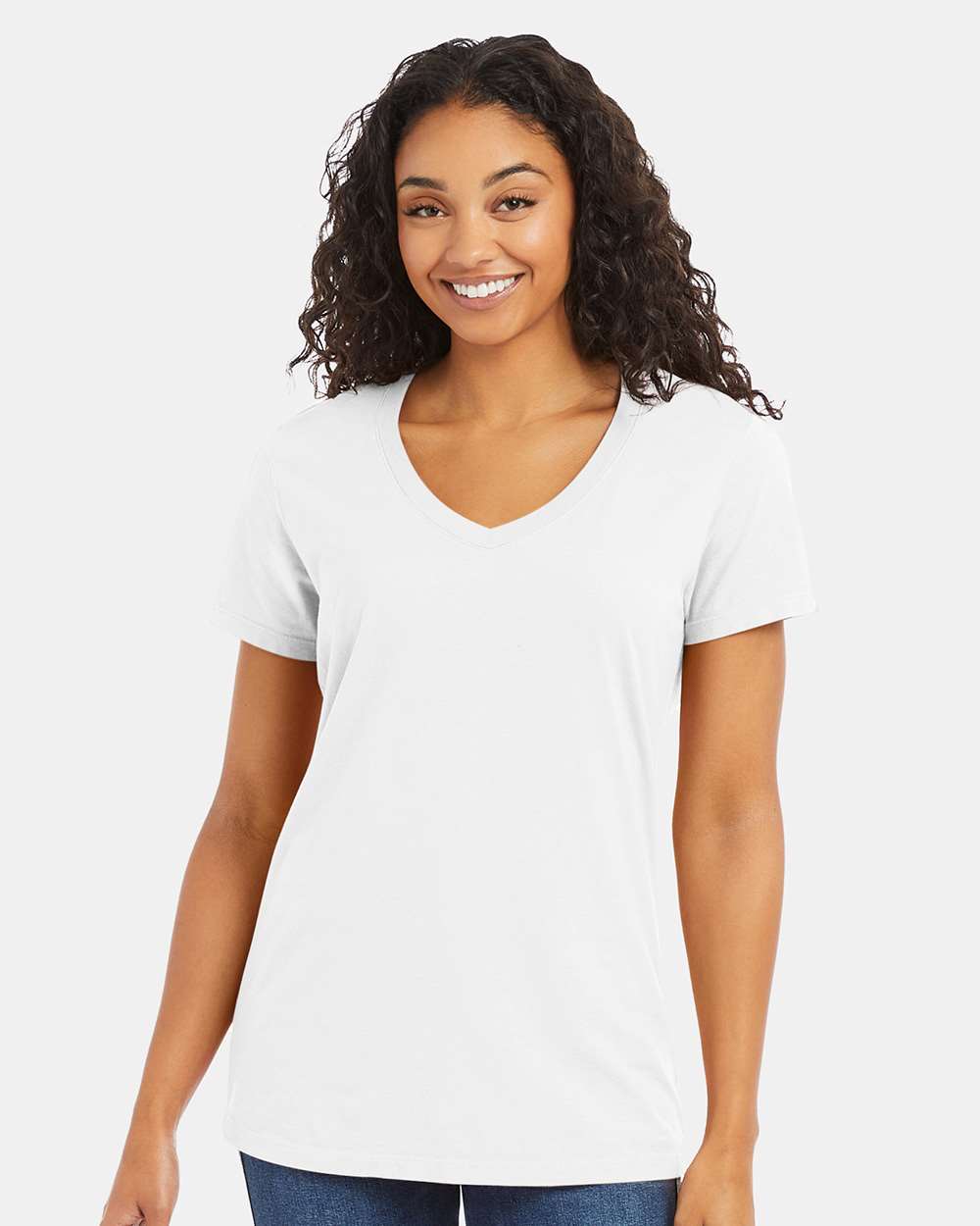 5.5 oz./yd_, US grown, 100% ring-spun cotton Pre-shrunk Contoured and side-seamed for feminine fit Mitered V-neck, coverstitched with lay flat collar...