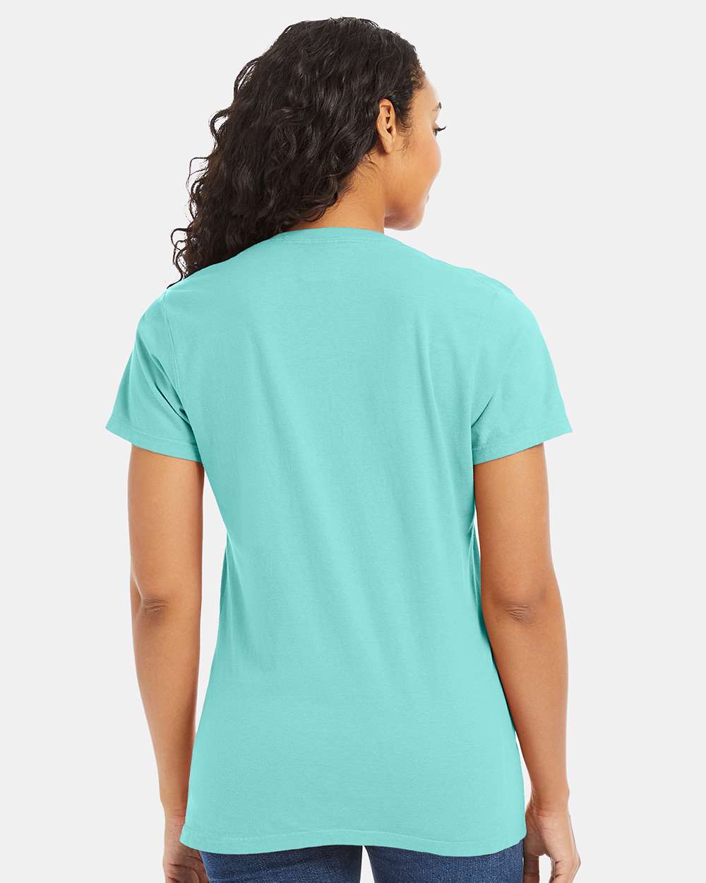 5.5 oz./yd_, US grown, 100% ring-spun cotton Pre-shrunk Contoured and side-seamed for feminine fit Mitered V-neck, coverstitched with lay flat collar...