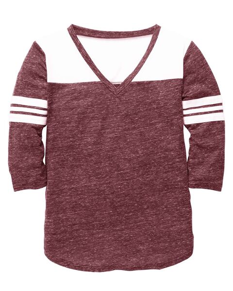 4.1oz., 90/10 Polyester/cotton snow heather jersey Contemporary fit Mitered V-neck Contrasting front and back yoke and sleeve stripes 3/4 sleeves...