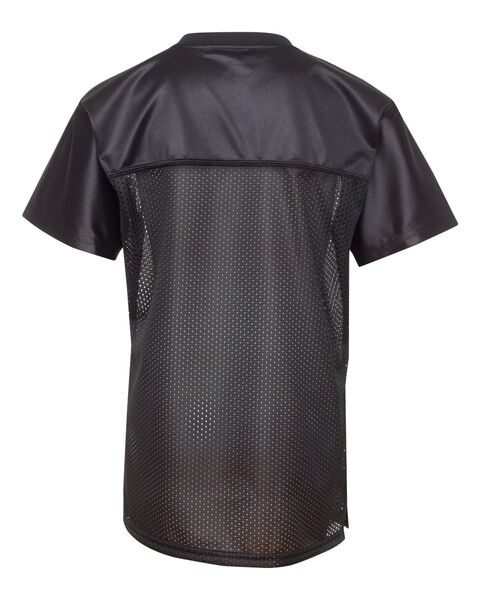 4.4 oz./yd_, 100% polyester tricot mesh 2.2 oz./yd_, 100% polyester dazzle fabric yoke and sleeves Rib-knit modified v-neck collar  Set-in sleeves...