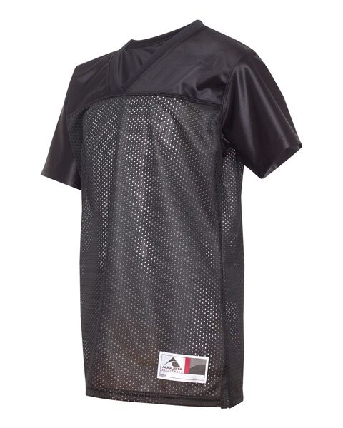 4.4 oz./yd_, 100% polyester tricot mesh 2.2 oz./yd_, 100% polyester dazzle fabric yoke and sleeves Rib-knit modified v-neck collar  Set-in sleeves...