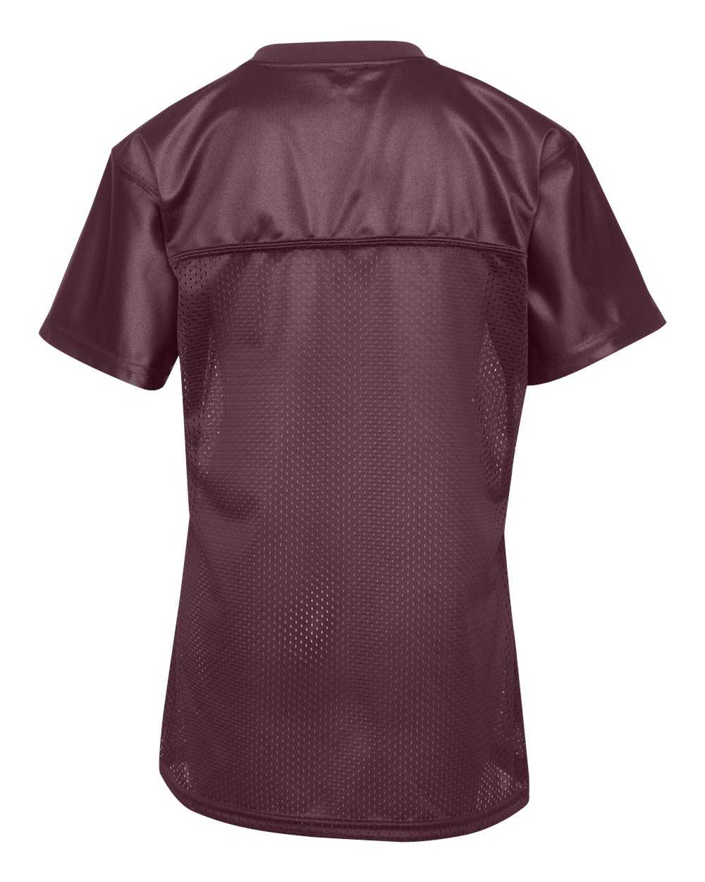 4.4 oz./yd_, 100% polyester tricot mesh 2.2 oz./yd_, 100% polyester dazzle fabric yoke and sleeves Rib-knit modified v-neck collar  Set-in sleeves...