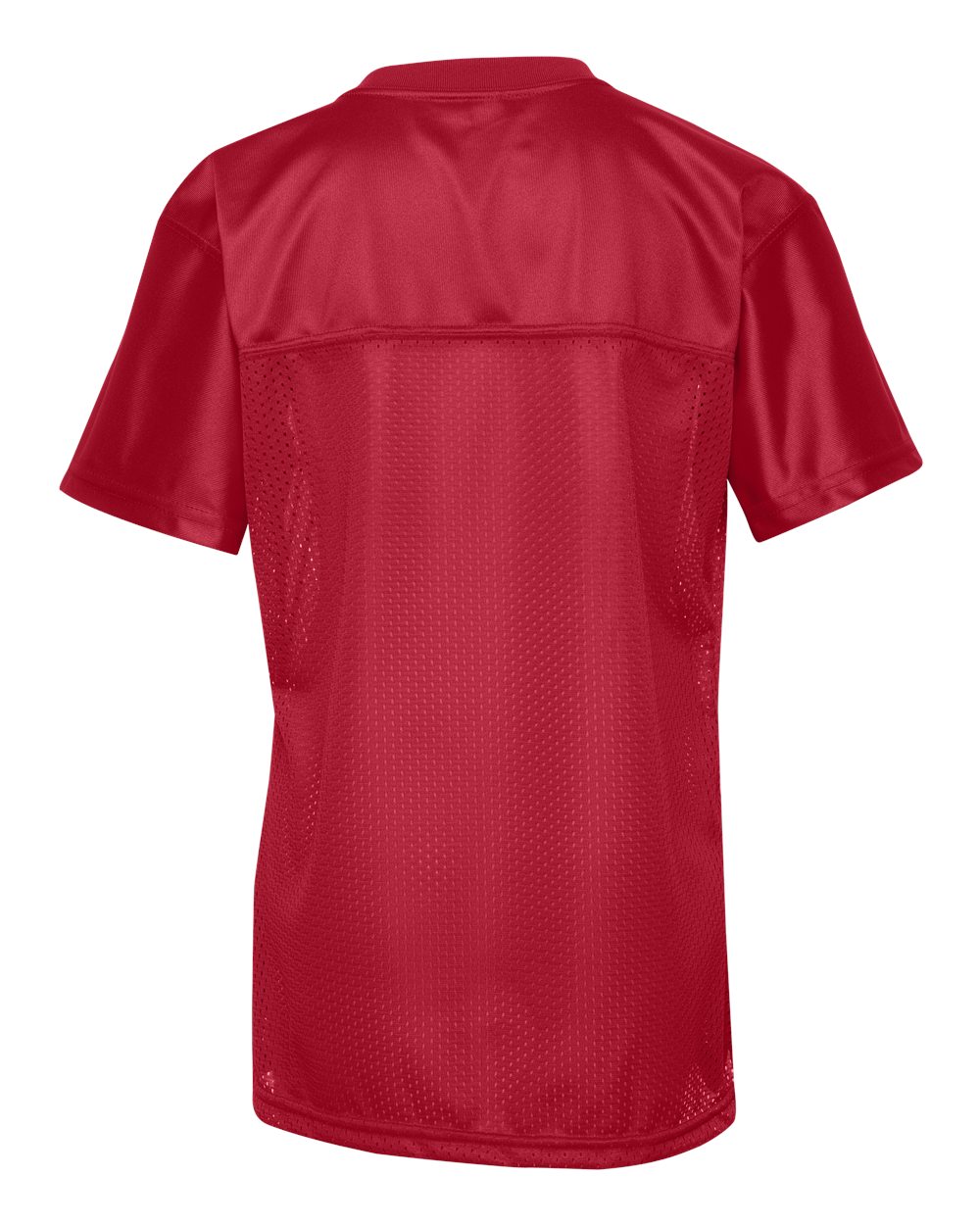 4.4 oz./yd_, 100% polyester tricot mesh 2.2 oz./yd_, 100% polyester dazzle fabric yoke and sleeves Rib-knit modified v-neck collar  Set-in sleeves...