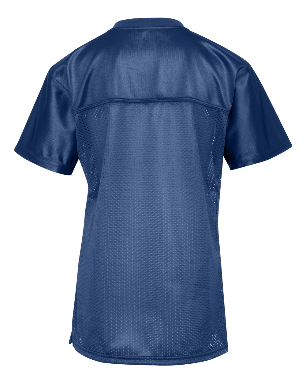 4.4 oz./yd_, 100% polyester tricot mesh 2.2 oz./yd_, 100% polyester dazzle fabric yoke and sleeves Rib-knit modified v-neck collar  Set-in sleeves...