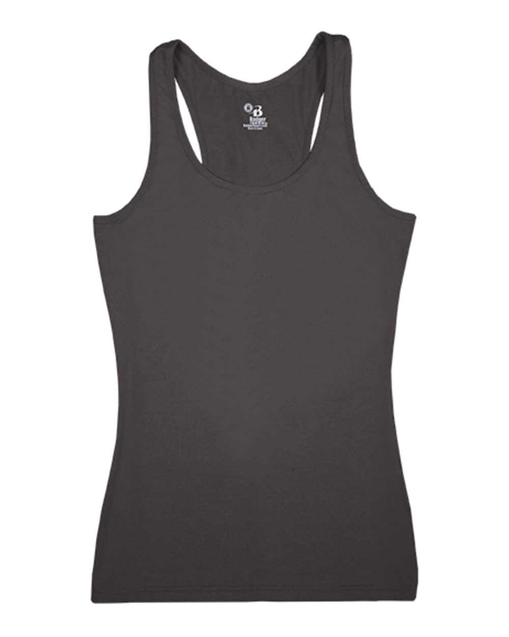 90/10 polyester/spandex moisture-management fabric Stretch body fit Self-fabric binding neck and armhole Racerback with room to print Double-needle hem...
