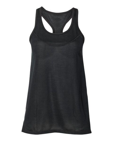 4.3 oz./yd_, 100% polyester cationic-dyed jersey Flare fit Scoop neckline Curved bottom Front yoke seam Racer back Heat transfer label