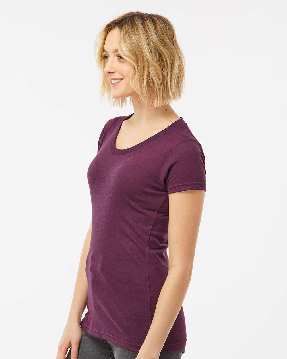 3.7 oz./yd_, 50/25/25 polyester/ring-spun USA premium cotton/rayon, 30 singles Feminine slim fit Ribbed crewneck collar Taped neck Side seams...