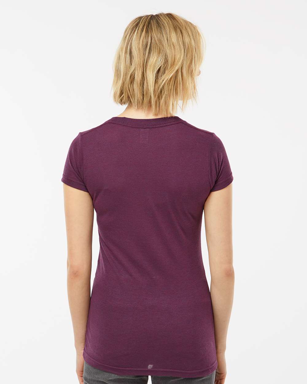 3.7 oz./yd_, 50/25/25 polyester/ring-spun USA premium cotton/rayon, 30 singles Feminine slim fit Ribbed crewneck collar Taped neck Side seams...