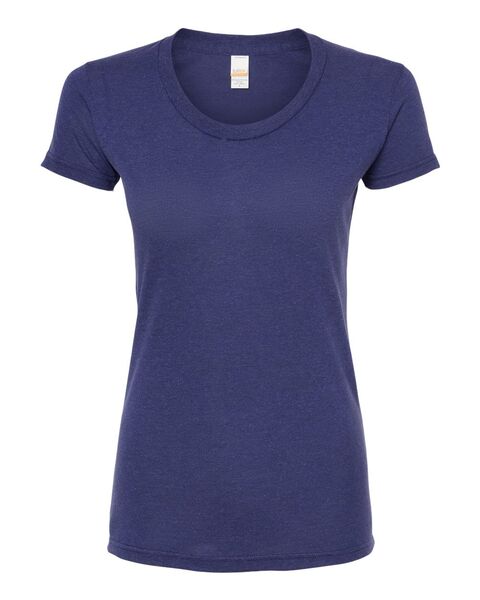 3.7 oz./yd_, 50/25/25 polyester/ring-spun USA premium cotton/rayon, 30 singles Feminine slim fit Ribbed crewneck collar Taped neck Side seams...