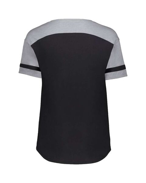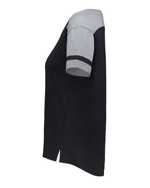 3.8 oz./yd_, 50/38/12 polyester/cotton/rayon triblend knit White/ Grey Heather is 4.7 oz./yd_ V-neck collar Set-in sleeves with angled...