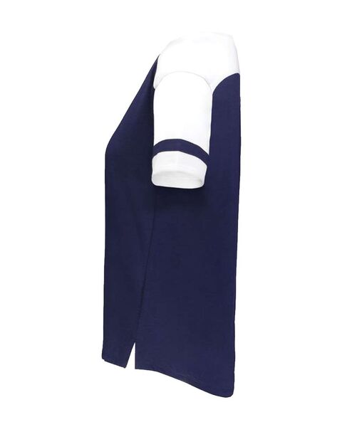 3.8 oz./yd_, 50/38/12 polyester/cotton/rayon triblend knit White/ Grey Heather is 4.7 oz./yd_ V-neck collar Set-in sleeves with angled...