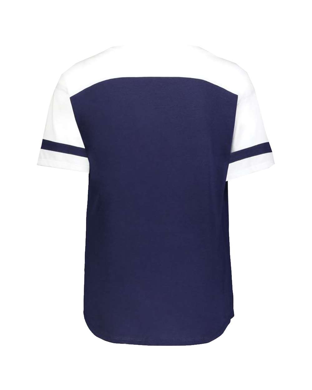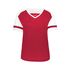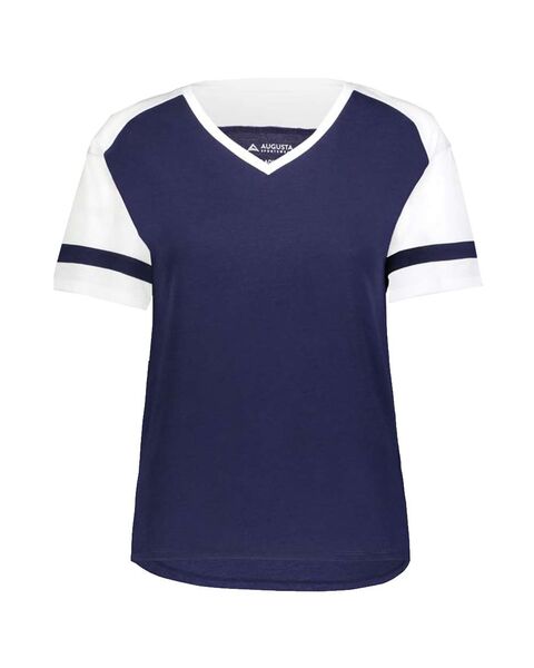 3.8 oz./yd_, 50/38/12 polyester/cotton/rayon triblend knit White/ Grey Heather is 4.7 oz./yd_ V-neck collar Set-in sleeves with angled...