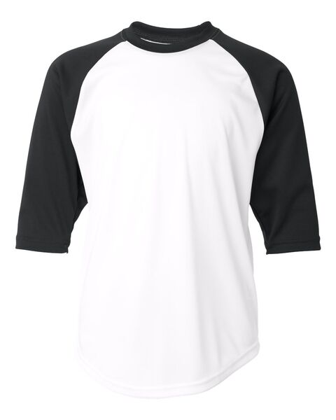 3.5 oz./yd_, 100% polyester moisture-management/antimicrobial performance fabric Contrasting 3/4 raglan sleeves Contrast self-fabric collar...