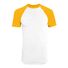 50/50 cotton/polyester jersey knit Contrast-color 1x1 ribbed-knit collar Contrast-color raglan sleeves Double-needle hemmed sleeves Serged fishtail...