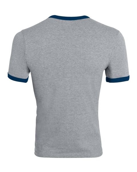 50/50 cotton/polyester Contrasting color 1x1 rib-knit collar and cuffs Double needle hemmed bottom
