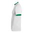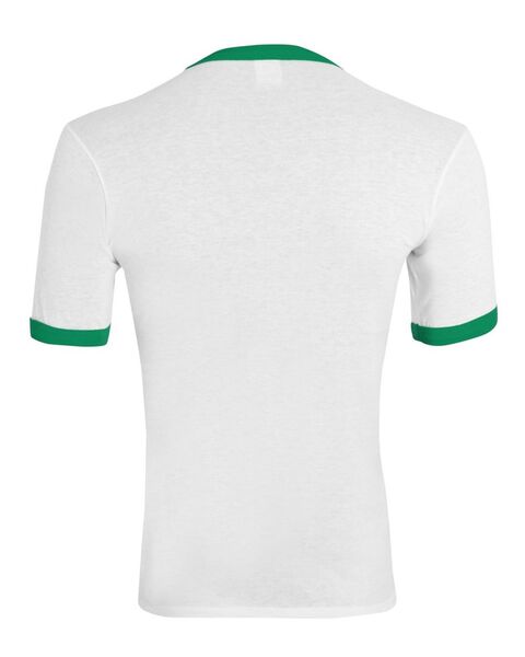 50/50 cotton/polyester Contrasting color 1x1 rib-knit collar and cuffs Double needle hemmed bottom