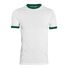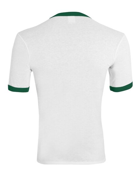 50/50 cotton/polyester Contrasting color 1x1 rib-knit collar and cuffs Double needle hemmed bottom