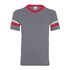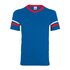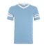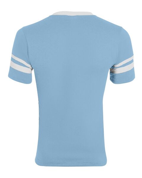 4.8 oz./yd_, 50/50 cotton/polyester knit jersey Contrast color 1x1 rib-knit V-neck collar Two white stripes on set-in double-needle stitched sleeves...