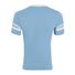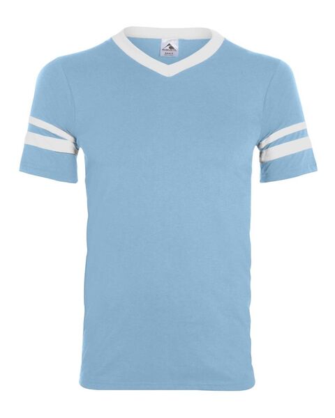 4.8 oz./yd_, 50/50 cotton/polyester knit jersey Contrast color 1x1 rib-knit V-neck collar Two white stripes on set-in double-needle stitched sleeves...