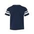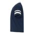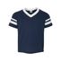 4.8 oz./yd_, 50/50 cotton/polyester knit jersey Contrast color 1x1 rib-knit V-neck collar Two white stripes on set-in double-needle stitched sleeves...