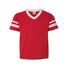 4.8 oz./yd_, 50/50 cotton/polyester knit jersey Contrast color 1x1 rib-knit V-neck collar Two white stripes on set-in double-needle stitched sleeves...
