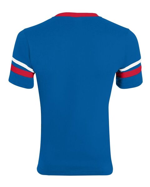 4.8 oz./yd_, 50/50 cotton/polyester knit jersey Contrast color 1x1 rib-knit V-neck collar Two white stripes on set-in double-needle stitched sleeves...
