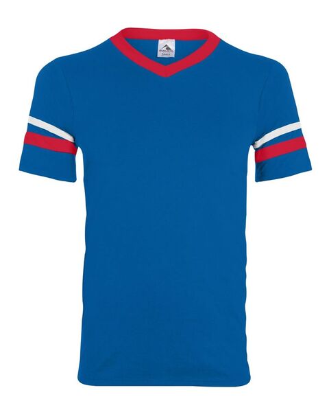 4.8 oz./yd_, 50/50 cotton/polyester knit jersey Contrast color 1x1 rib-knit V-neck collar Two white stripes on set-in double-needle stitched sleeves...