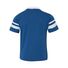 4.8 oz./yd_, 50/50 cotton/polyester knit jersey Contrast color 1x1 rib-knit V-neck collar Two white stripes on set-in double-needle stitched sleeves...