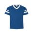 4.8 oz./yd_, 50/50 cotton/polyester knit jersey Contrast color 1x1 rib-knit V-neck collar Two white stripes on set-in double-needle stitched sleeves...