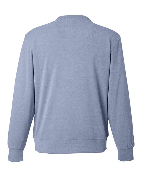 8.3 oz./yd_, 90/10 polyester/spandex brushed fleece Cover-stitched throughout Textured look fabric Self-fabric collar, cuffs, and waistband Tear...