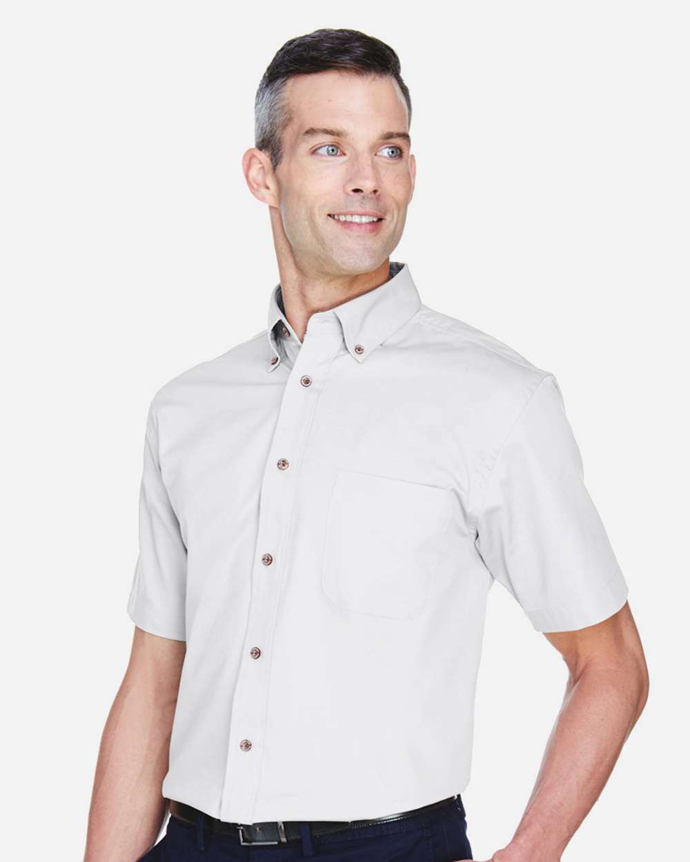 4.5 oz./yd_/155 gsm (US), 7.5 oz./L yd (CA), 55% cotton, 45% polyester twill Wrinkle-resistant and stain release fabric Button-down collar Left chest...
