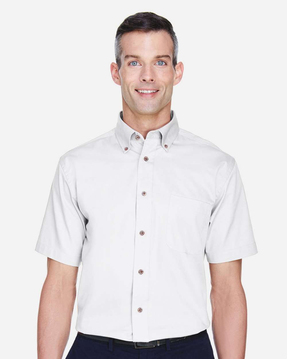 4.5 oz./yd_/155 gsm (US), 7.5 oz./L yd (CA), 55% cotton, 45% polyester twill Wrinkle-resistant and stain release fabric Button-down collar Left chest...