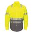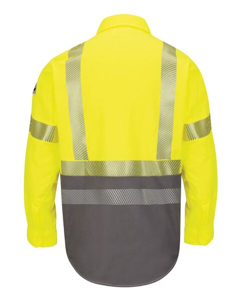 - Color blocked shirt with hi vis upper half for ANSI compliance and grey lower half to conceal dirt and stains