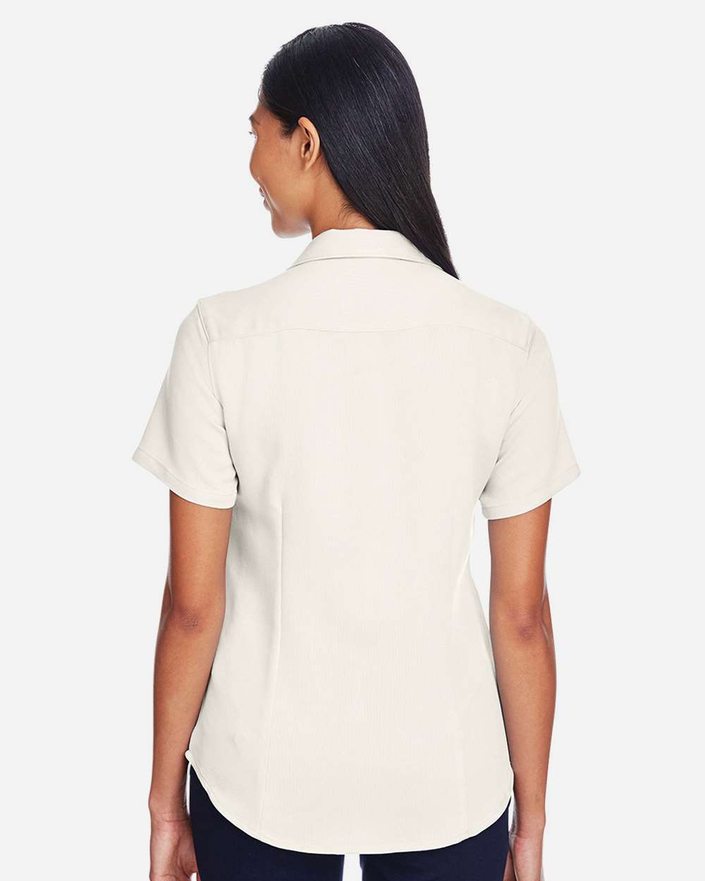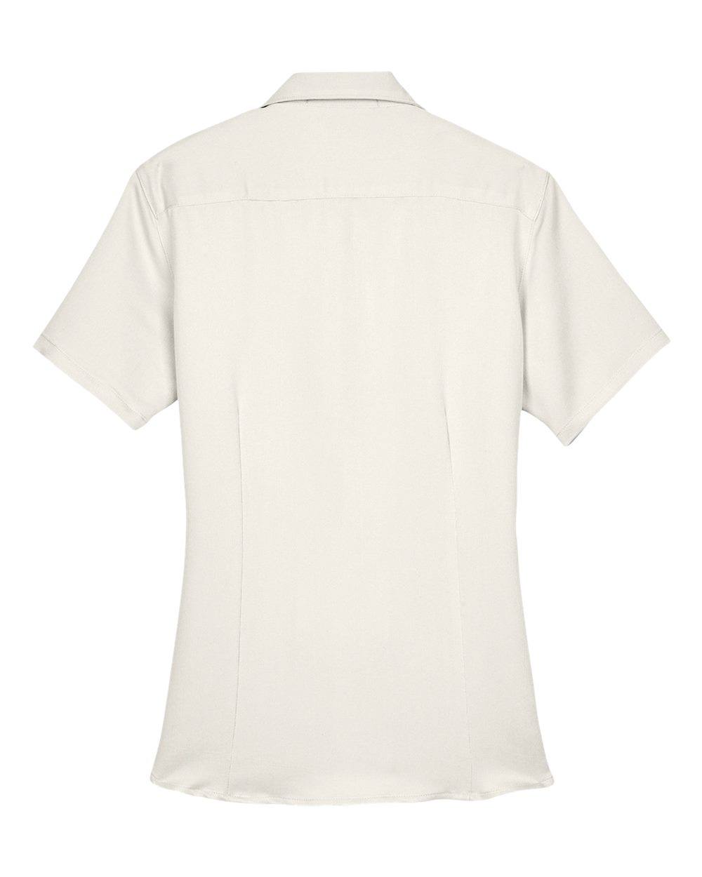 5 oz./yd_, 66/34 rayon/polyester pieced bedford cord Wrinkle-resistant Feminine fit with darts Self-fabric collar Full-button front Contrast panels...